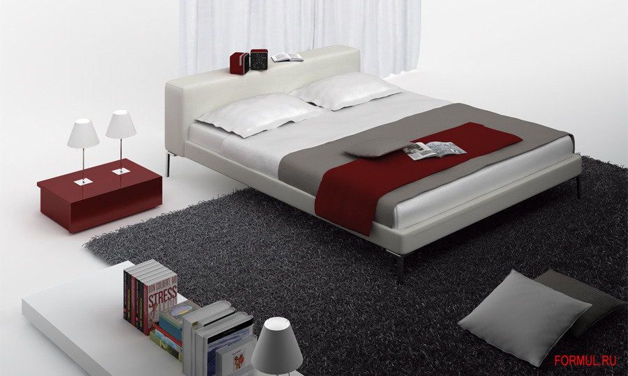 Мягкая кровать, с толстым изголовьм. Ножки представлены в естественной алюминиевой отделке.