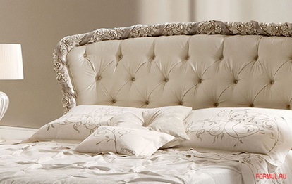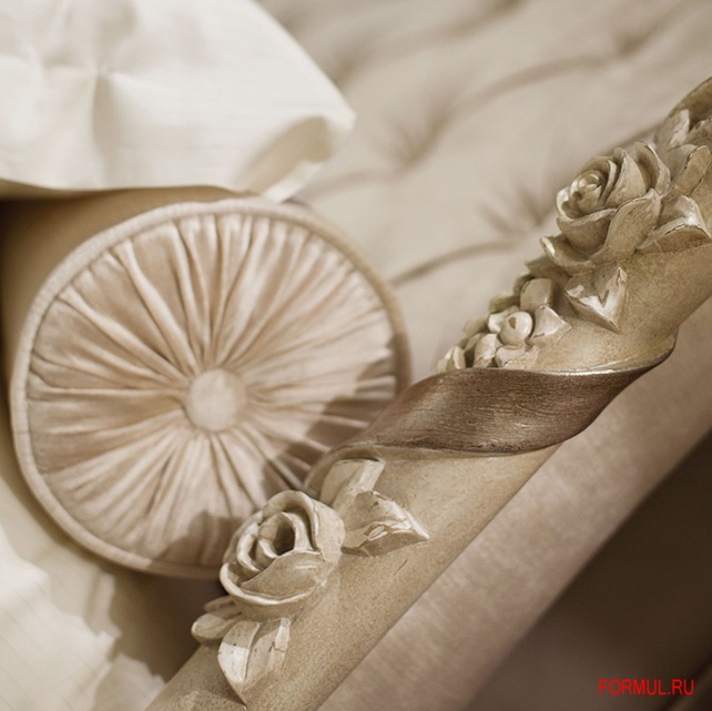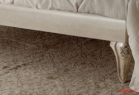 Кровать с изумительным изголовьем. Рама сделана из массива, в центре мягкая обивка с ручной стяжкой. Края спинки кровати и ножек обрамлены маленькими розочками. В декоре также применяется инкрустация.