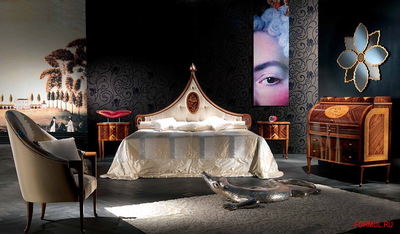 Материал каркаса - массив клена, отделка - профилей - шпон палисандра. Мягкон фигурное изголовье "увенчано" рельефным букетом ручной работы.