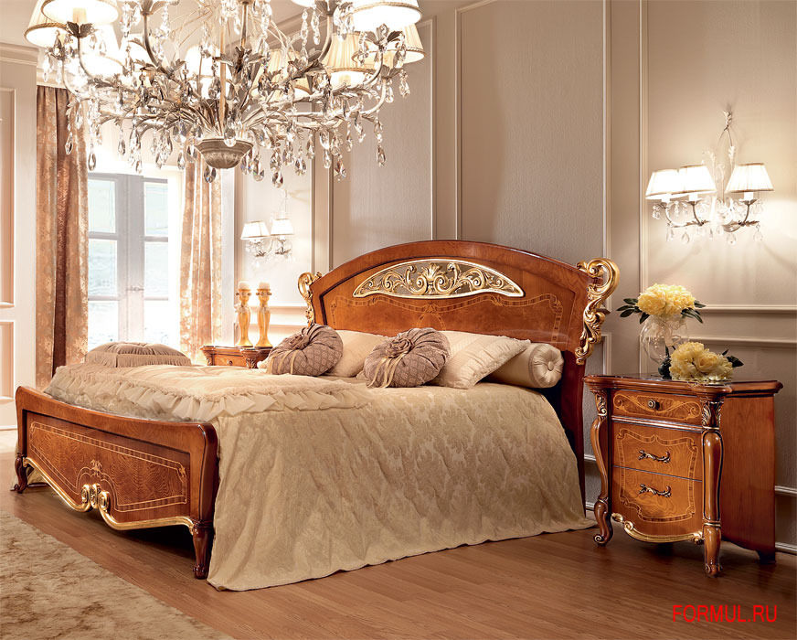 Кровать занимает центральное место в спальне и представлена в двух моделях – с мягким изголовьем и с деревянным из шпона радика. Оба изголовья венчаются резными декоративными арками. Кровать с обитым тканью изголовьем прекрасно гармонирует с другими моделями