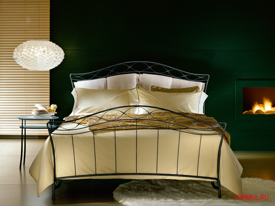 Двуспальная кровать с кованым изножьем и мягким изголовьем. Каркас из кованого железа предлагается во множестве вариантах отделок: антрацитово-серый, зеленый «антик» , американский синий, синий сапфир, светло-кремовый, табак, светло-серый, черный чугунный, цвета ржавчины, табак патинированный с золотом, белый «антик», бело-голубой патинированный. Доступны и специальные отделки: сусальное серебро «антик», сусальное золото, яркое сусальное серебро.