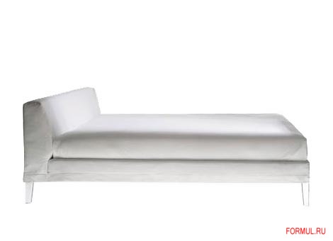 Двуспальная кровать с деревянным и стальным каркасом, ножки из прозрачного полиметилметакрилата, со съемным чехлом из ткани или кожи.