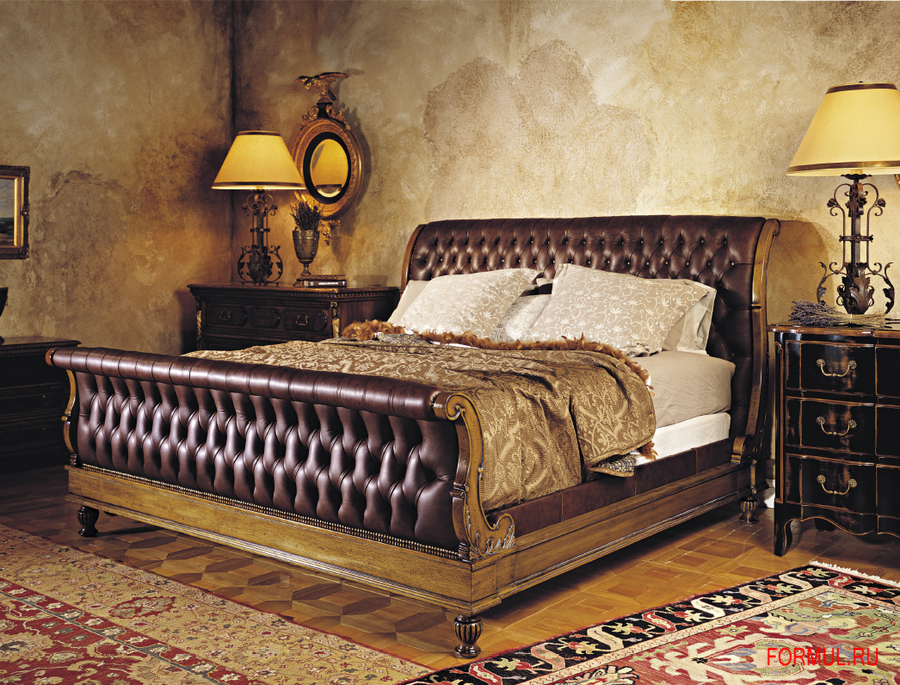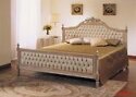 Кровать с изголовьем обтянутым кожей. Декорирована техникой "капитоне" и резными элементами.