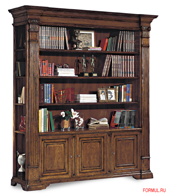 Книжный шкаф с открытый полками из орехового дерева и закрытой секцией в основании.
