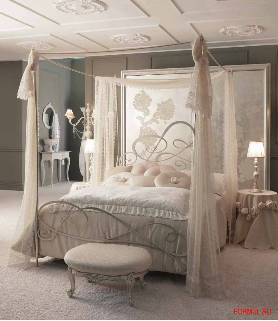 Кованая кровать с балдахином Lolita декорирована белым патинированным покрытием.