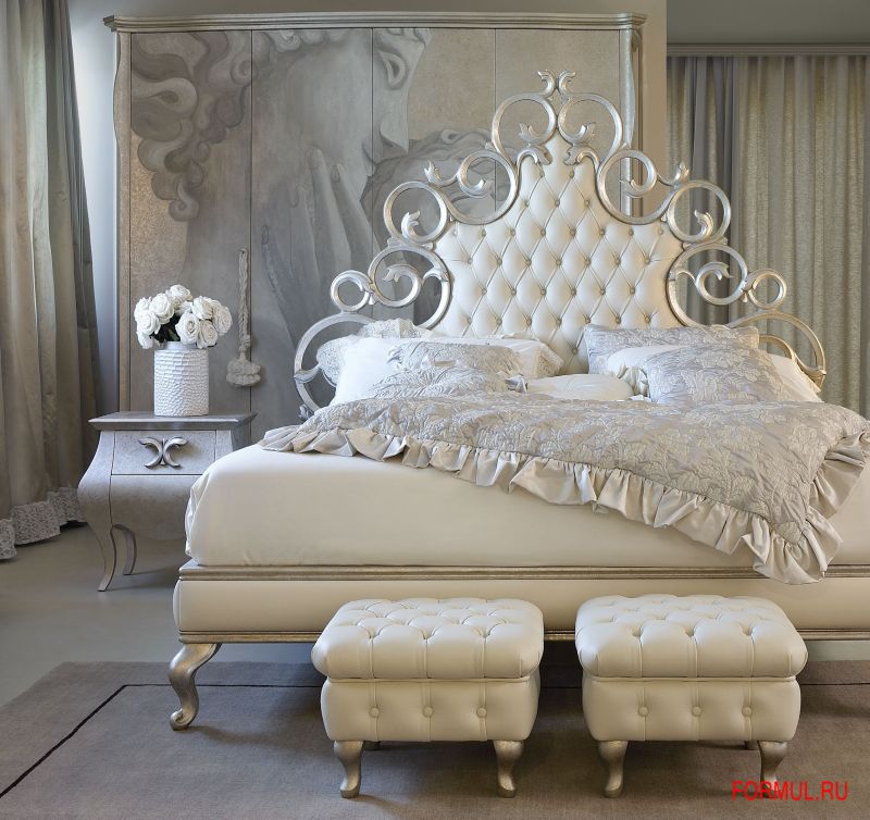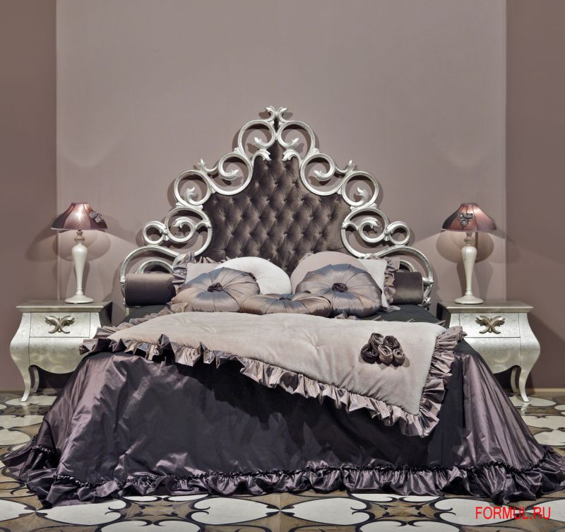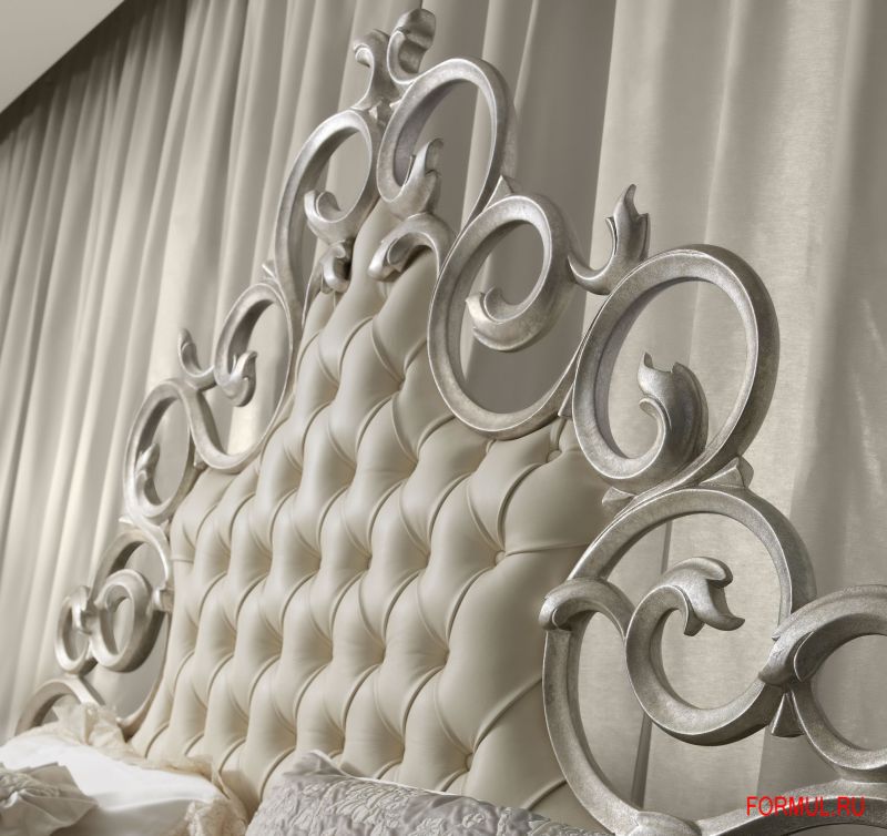 Высокое изголовье украшено декоративной стежкой капитоне и резьбой ручной работы.