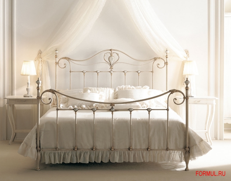 Изголовье и изножье дополнены керамическими деталями и декорированы покрытием цвета слоновой кости. Благодаря строгости дизайна и лаконичной четкости линий кровать может органично дополнить классический интерьер, а также оформление в античном стиле или в духе модерн.