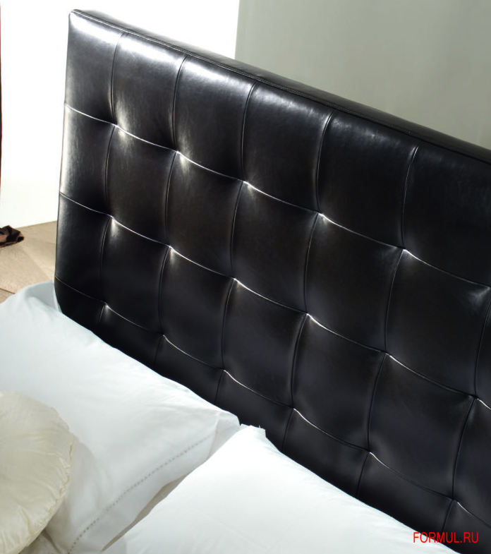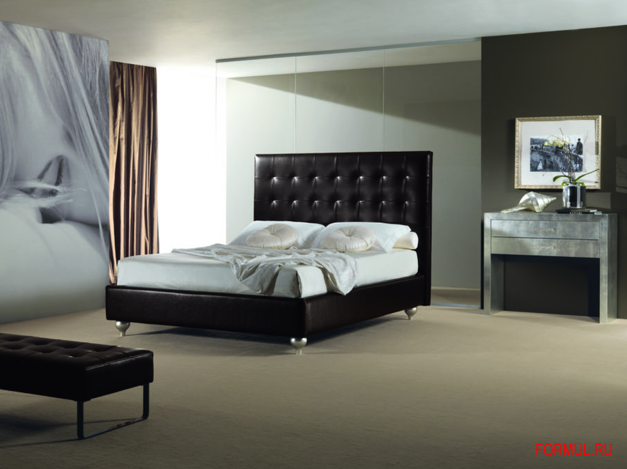 Двуспальная кровать с высоким обитым изголовьем и основанием. Изголовье обито в технике капитоне. Возможны другие варианты ножек и обивки.