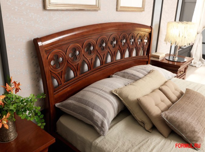 Изголовье и изножье: ножки, поручень, панель резная, архитектурные элементы и рамка цоколя выполнены из массива тюльпанового дерева.