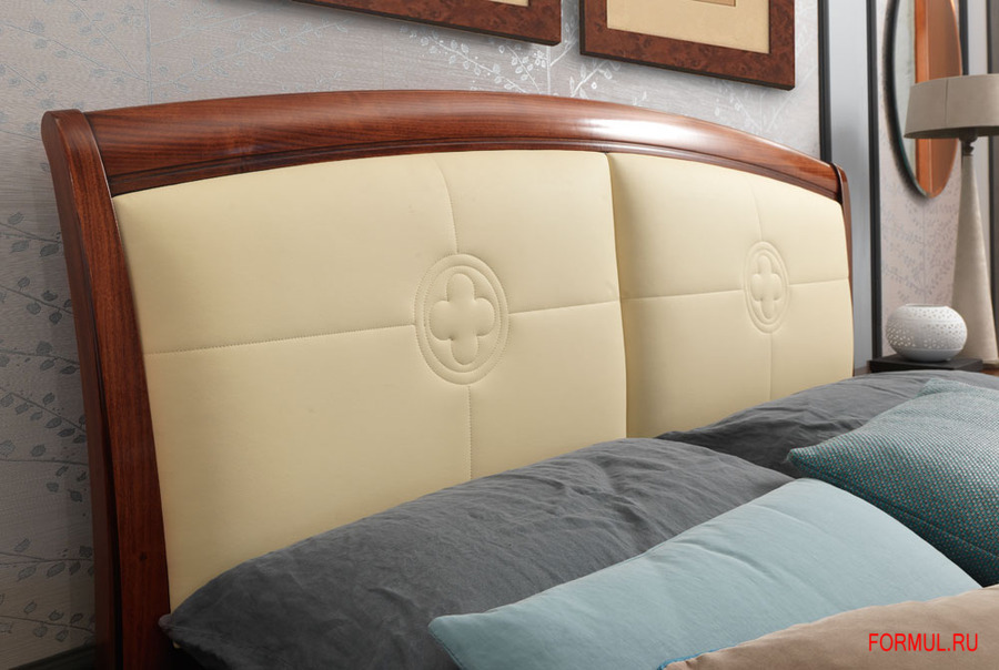 Изголовье и изножье: ножки, поручень, панель резная, архитектурные элементы и рамка цоколя выполнены из массива тюльпанового дерева.