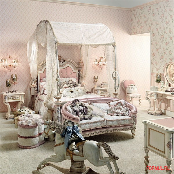 Широкая детская кровать из массива древесины. Изголовье и изножье обильно украшены резьбой (корона, розы) и росписью (цветы, ангелочки) ручной работы. Мягкая вставка изголовья оформлена стежкой-капитоне, где вместо пуговиц использованы текстильные розы. Ножки-столбики "вырастают" в опоры из окрашенного металла в отделке позолотой, предназначенные для крепления балдахина из тонкого текстиля, декорированного шитьем и кружевами.
