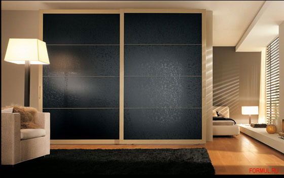 Отделка: Боковые стенки лакируются в молочный или кофейный цвет. Фасады дверей выполнены из матового стекла, тонированного под бронзу. Нанесенный зеркальным рисунок, имитирует фактуру льда. Материал отделки дверей из темного дуба и матового стекла. Рама дверей - алюминий.