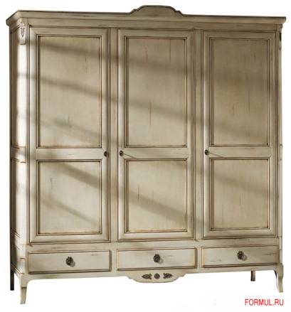 Платяной шкаф из древесины. Выполнен в классическом стиле. Включает три распашные дверцы и три выдвижных ящика в традиционном соединении "ласточкин хвост". Отделка поверхностей - лак белого цвета, пчелиный воск.