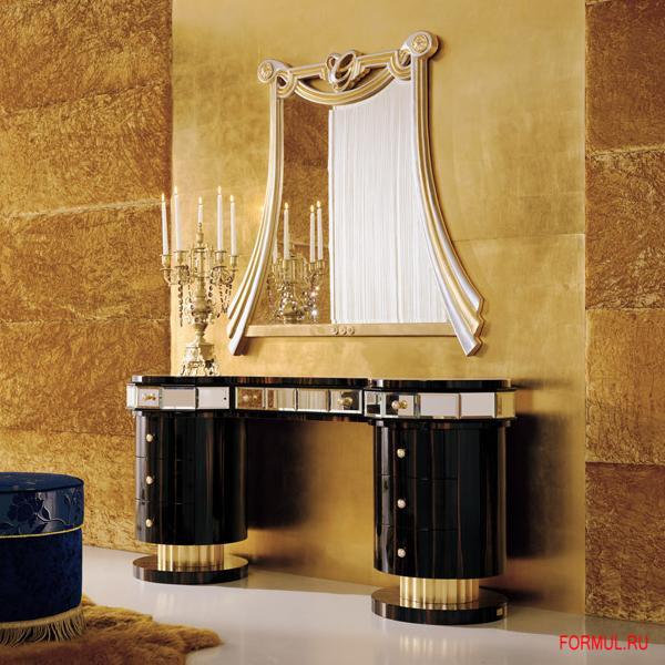 Туалетный столик в стиле ар-деко. Модель на двух цилиндрических опорах-тумбах выполнена из массива и мультистрато. Отделка - эбеновое дерево, глянцевый лак, золотая / серебряная фольга. Декор - стразы Swarovski.