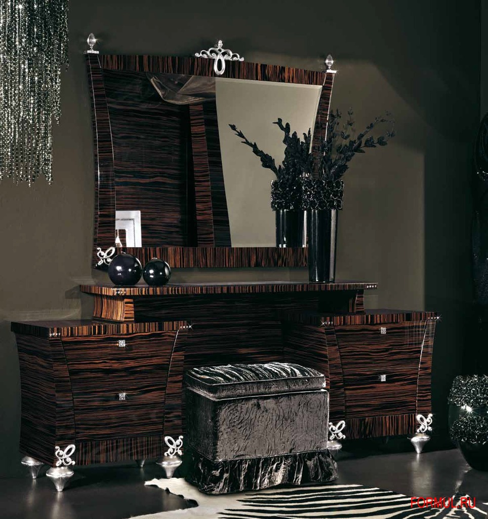 Туалетный столик с 4-мя ящиками, столешница выполнена с декоративной стеклянной вставкой, фигурные ножки. Декорирован резными элементами, ручки выполнены с кристаллами Swarovski. Возможны другие варианты отделки.