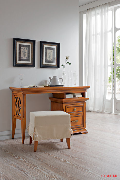 Туалетный столик (с право или левосторонней тумбой). Корпус выполнен из ДСП отделанной шпоном европейской вишни (внешняя сторона),шпоном анегри (внутренние видимые части) или бумагой. Задние стенки комодов и прикроватных тумбочек из многослойной фанеры из тополя. Панели ДСП и многослойной фанеры полностью соответствуют норме Е1 (продукт с низким содержанием формальдегида). Резная вставка и барельеф из массива ольхи.
