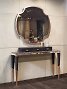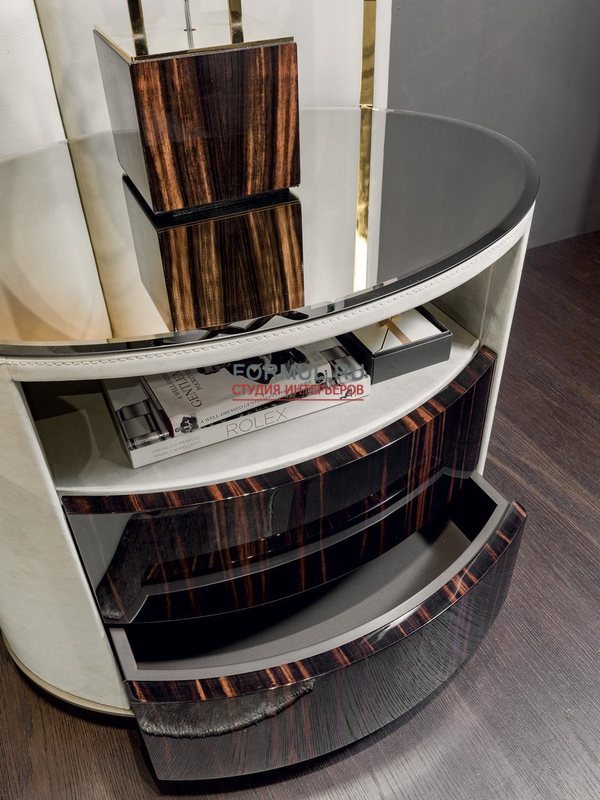 Прикроватная тумбочка, обитая кожей, с двумя выдвижными ящиками. Столешница из стекла или мрамора.