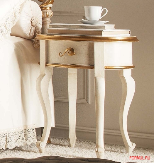 Прикроватная тумбочка из дерева круглой формы с ножками кабриоли и выдвижным ящиком – это образец классического стиля.