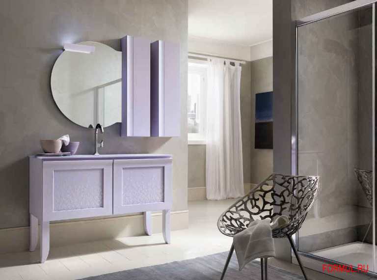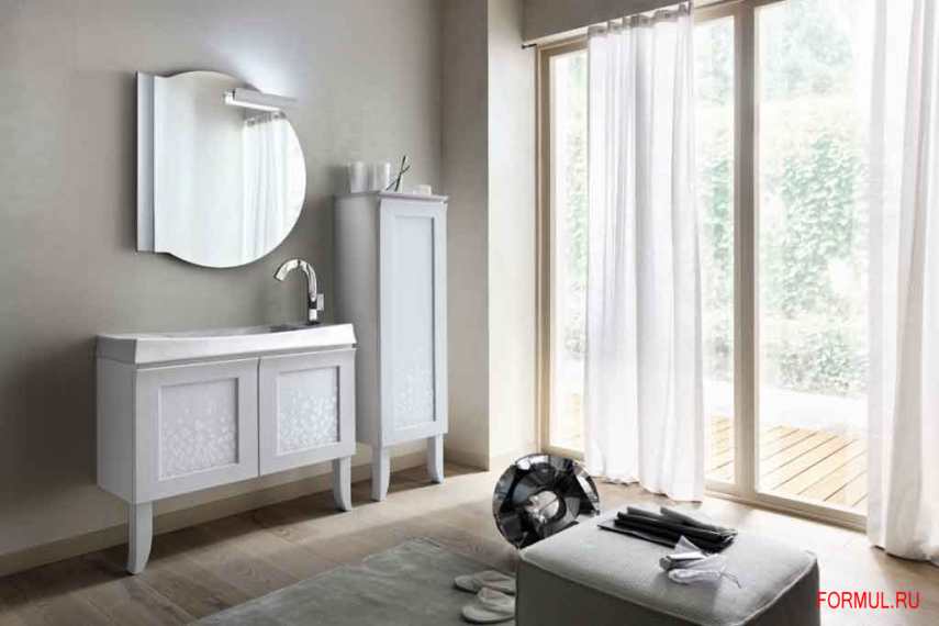 Композиция CR1 состоит из тумбы на ножках, шкаф-пенала и зеркала. Каркас мебели из ДСП, фасад из крашеного МДФ.