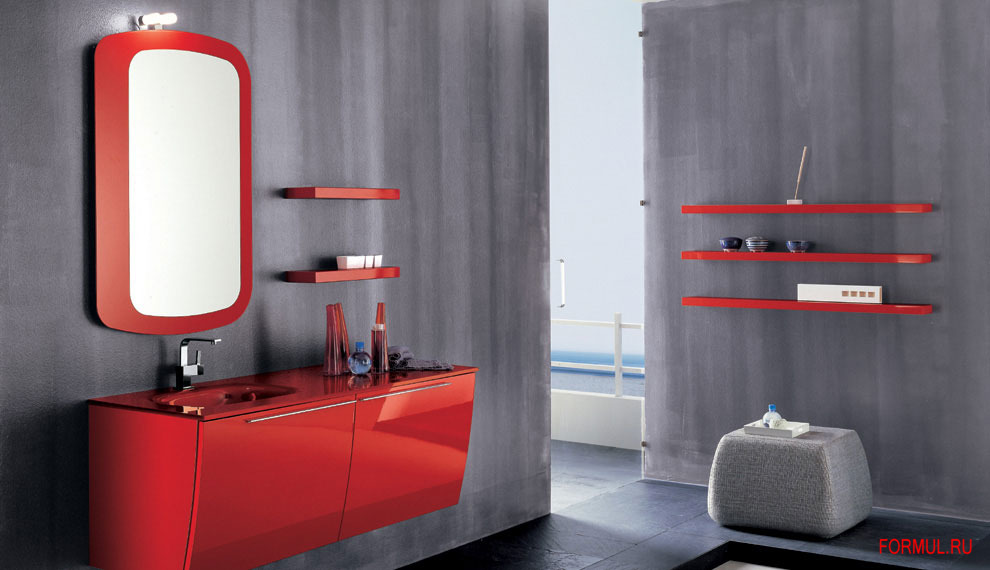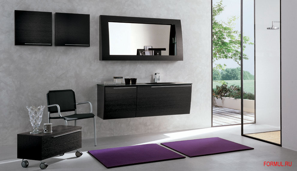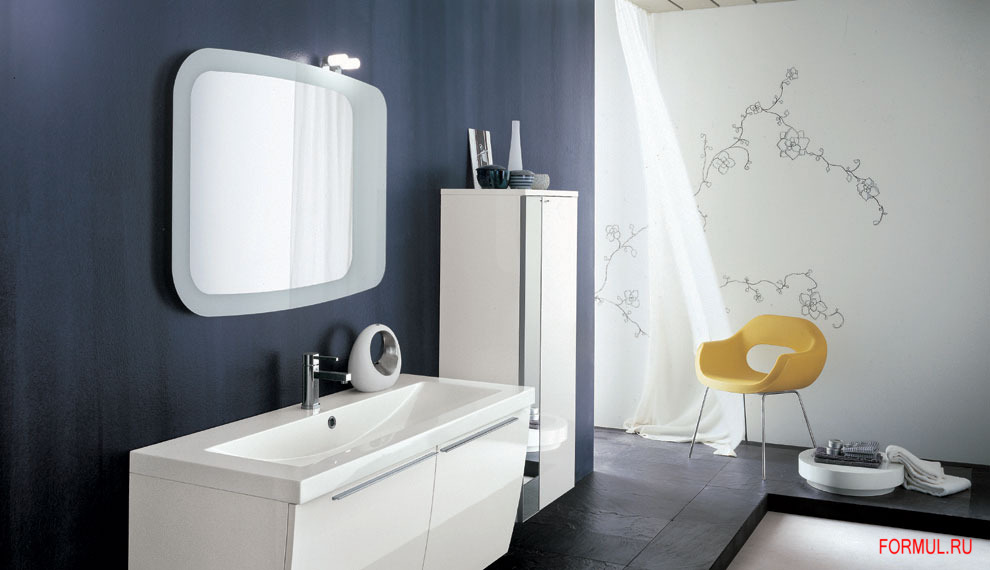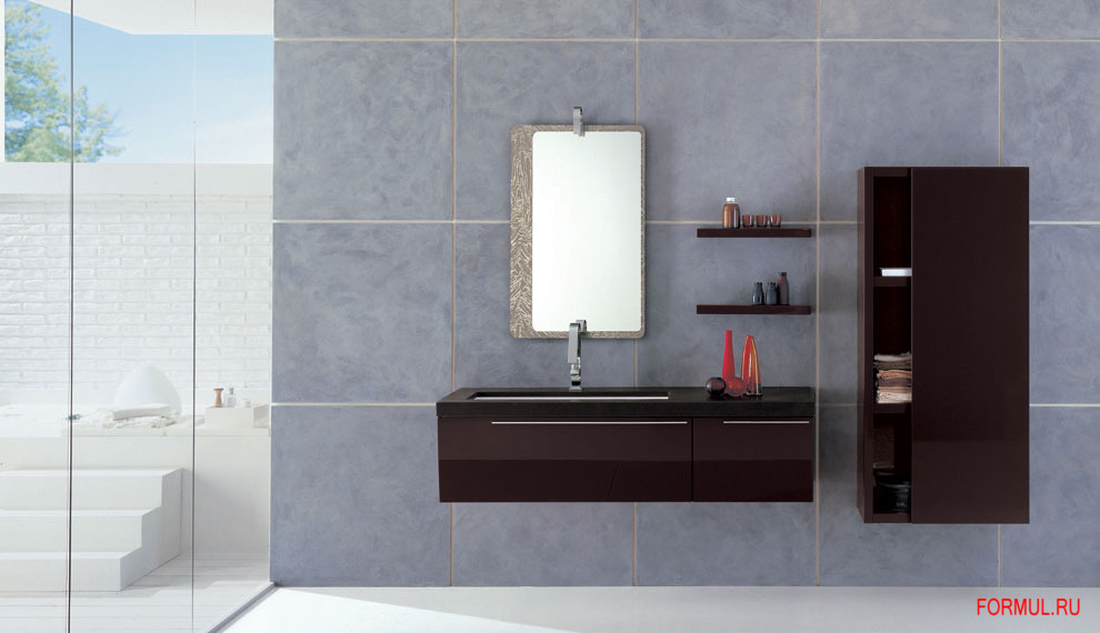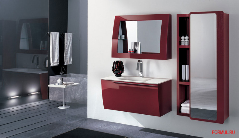 Каркас мебели из ДСП, фасад из крашеного МДФ. Подвесная тумба с одним выдвигающимся ящиком. Глубина тумбы изменяется от столешницы (50см) к нижней части (45см). Столешница и раковина объединены в моноблок из материала «Tecnoril». Зеркало-шкаф прямоугольной формы + светильник. Композицию дополняет пенал с зеркальной дверцей (глубина 35см, ширина 70см, ширина дверцы 50см, h 150см).