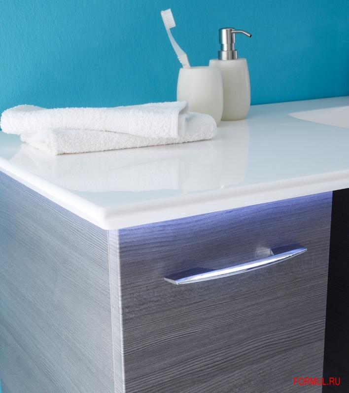 Тумба изготовлена из водостойкого материала с отделкой из каталога фабрики.