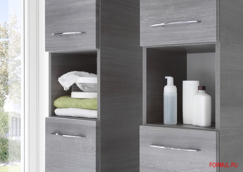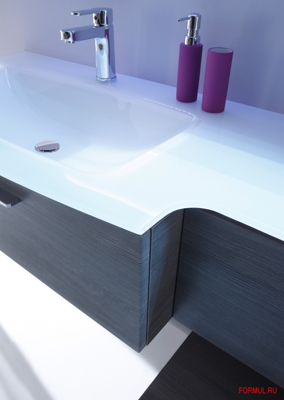 Предметы композиции: подвесная тумба с выдвижными ящиками и встроенной раковиной, а также зеркало со светильником, колонны и раковины, подвесные ящики.