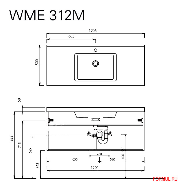 Раковина № 1 из минерального литья c квадратной чашей (белый) *50*1206*500, арт. WME 312M 1