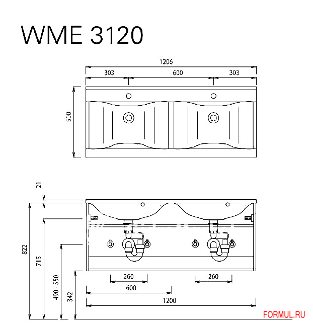 Раковина № 1 из минерального литья двойная c квадратной чашей (белый) *50*1206*500, арт. WME 3120 1
