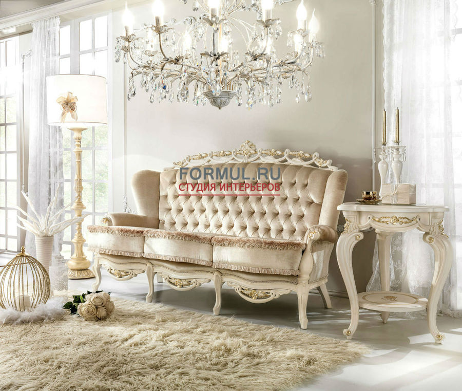 Диван и кресла выполнены из натуральных материалов, добротной древесины, виртуозно украшенны ручной резьбой, покрытой русальным золотом и серебром. Использованы натуральные и экологичные наполнители, элитный текстиль приятной фактуры.