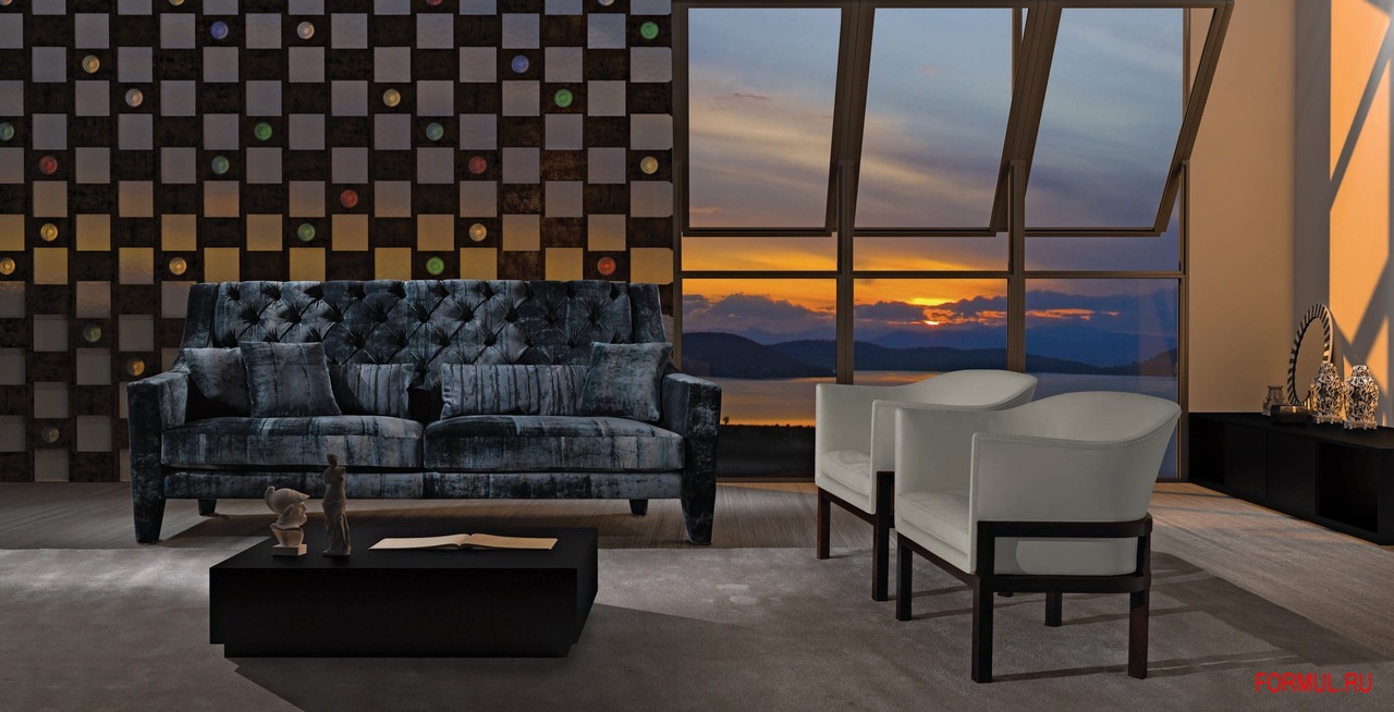 Элегантная модель с оригинальными покатыми подлокотниками и наклонной спинкой, выполняется в обивке тканью или кожей (обивка спинки - ромбовидная с декоративными пуговицами, обивка сиденья - гладкая), размер от 170х110х104 см.