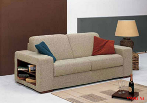 Диван трёхместный от итальянского производителя LOIUDICED, модель QUARK-3. Диван с раскладным механизмом в современном стиле. В подлокотник вмонтирована деревянная полка. На заказ возможны различные варианты обивки кожи, ткани и ножек.