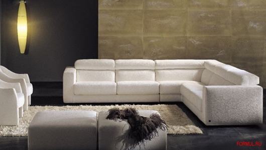 Угловая система диванов, обитых тканью. Связь между элементами осуществляется с помощью специальных небольших осей.