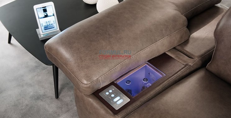 Это первый настоящий диван технологий. Диван Redmond оснащен холодильными камерами с подсветкой, подогревом сидений и спинки, 4d симулятор, кресло и подголовник электрические, может быть подключен к смартфону или планшету, Bluetooth 4.0, звук 2.1(с дополнительным планшетом). Деревянный корпус с высоко устойчивыми эластичными ремнями. Подушки сиденья и спинка наполнены полиуретановой пеной. Металлические ножки с хромированной отделкой. Большой выбор отделок из кожи и ткани.