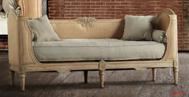 Диван выполнен из массива дуба обитого желто-бежевой тканью.