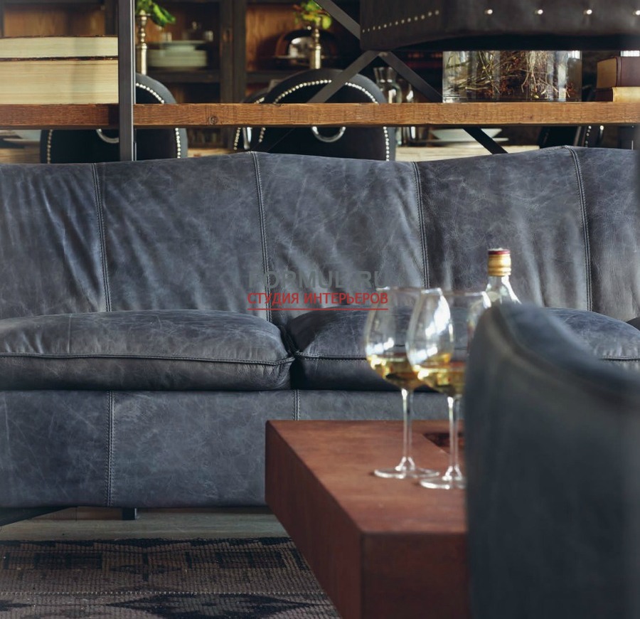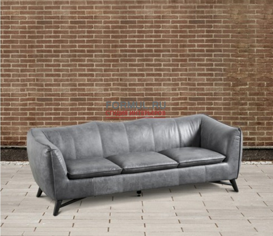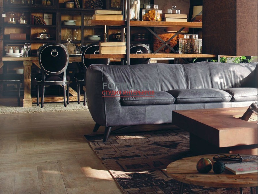 Диван со структурой из дерева, обивка из состаренной кожи, серого цвета.