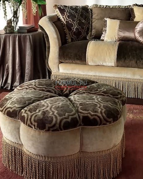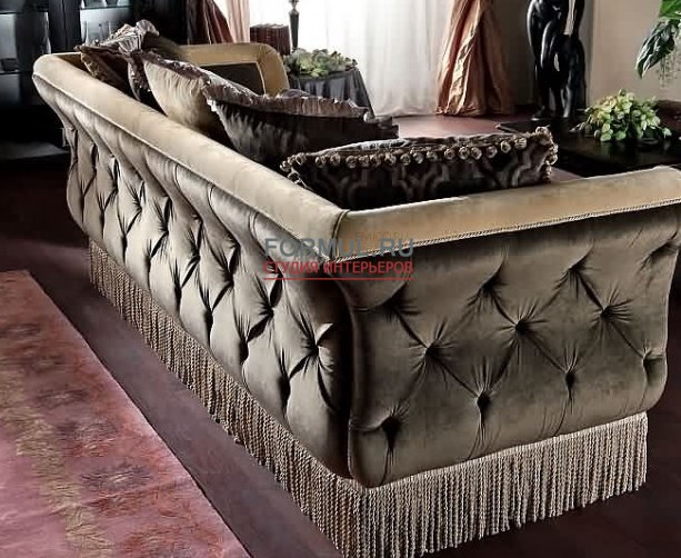 Уютный классический диван с контрастной обивкой по всему каркасу, с бахромой по низу дивана. Дополнен удобными подушками.