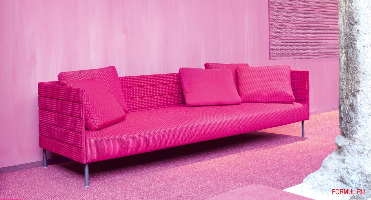 Трехместный диван для открытых пространств, обтянут водоотталкивающим материалов ярких оттенков.