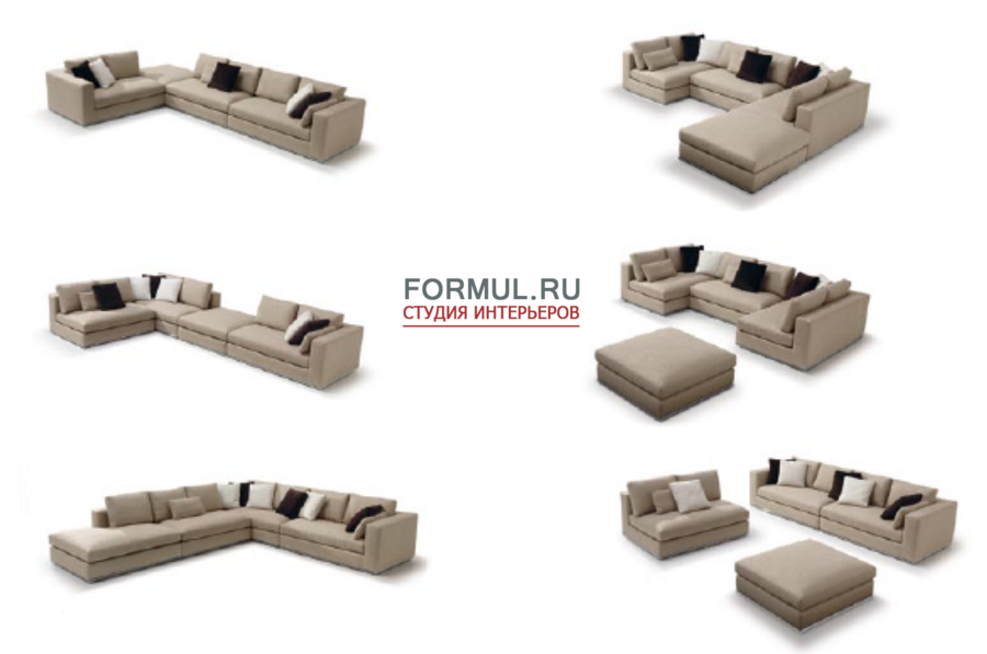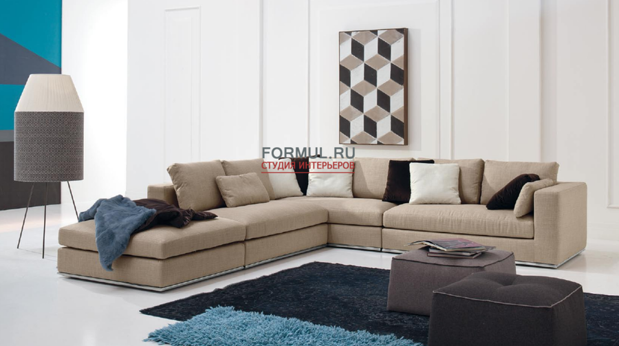 Угловой модульный диван с боковым пуфом, фиксированной спинкой и поддерживающими подушками.