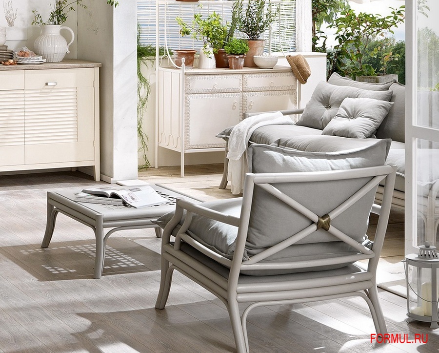 Кресло на ножках и журнальный столик, который можно использовать как пуфик для ног. Каркас из массива дополнен воздушными удобными подушками как на спинках, так и на сиденьях.