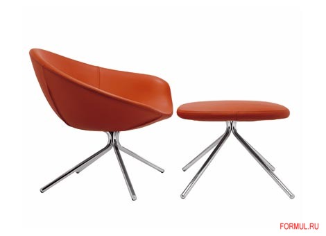 Кресло и пуф. Хромированный стальной каркас, сидение из пенополиуретана. Варианты покрытия: шерстяная ткань красного цвета, кожа оранжевого или белого цвета. Тканевое покрытие пуфа съемное.