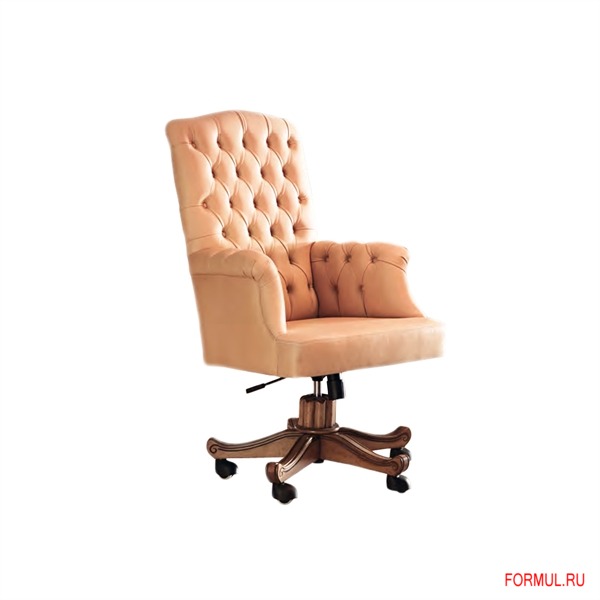Кресло для руководителя в классическом стиле. Выполнено на пятилучевом основании из массива натуральной древесины. Обивка – материалы из ассортимента компании. Модель декорирована стежкой-капитоне.