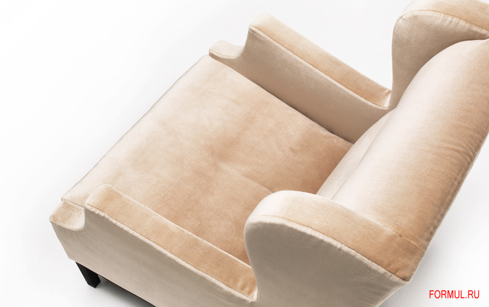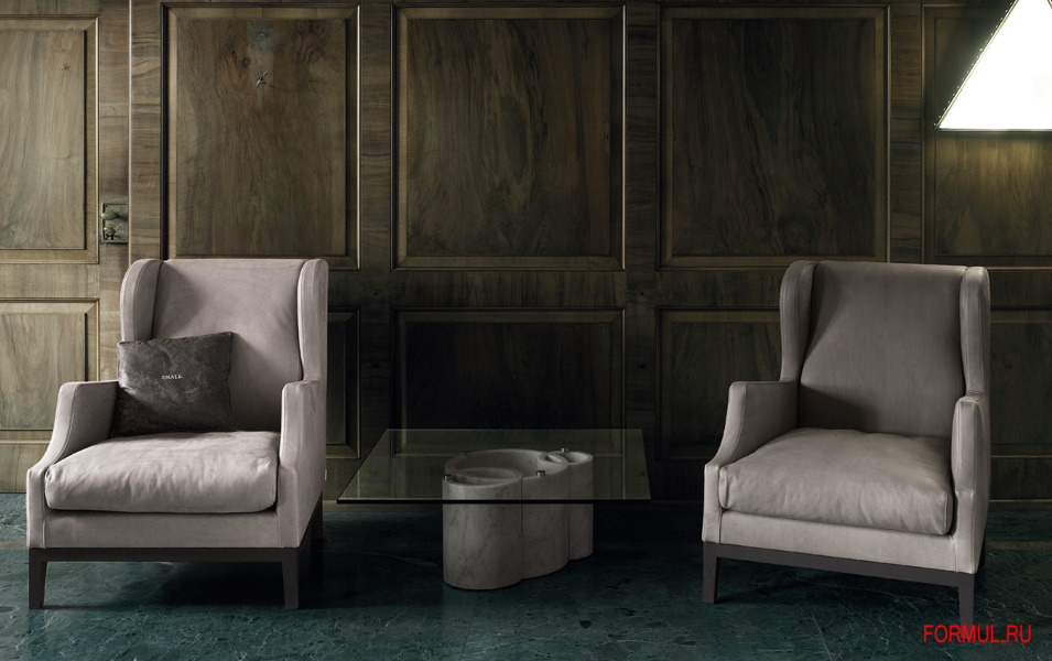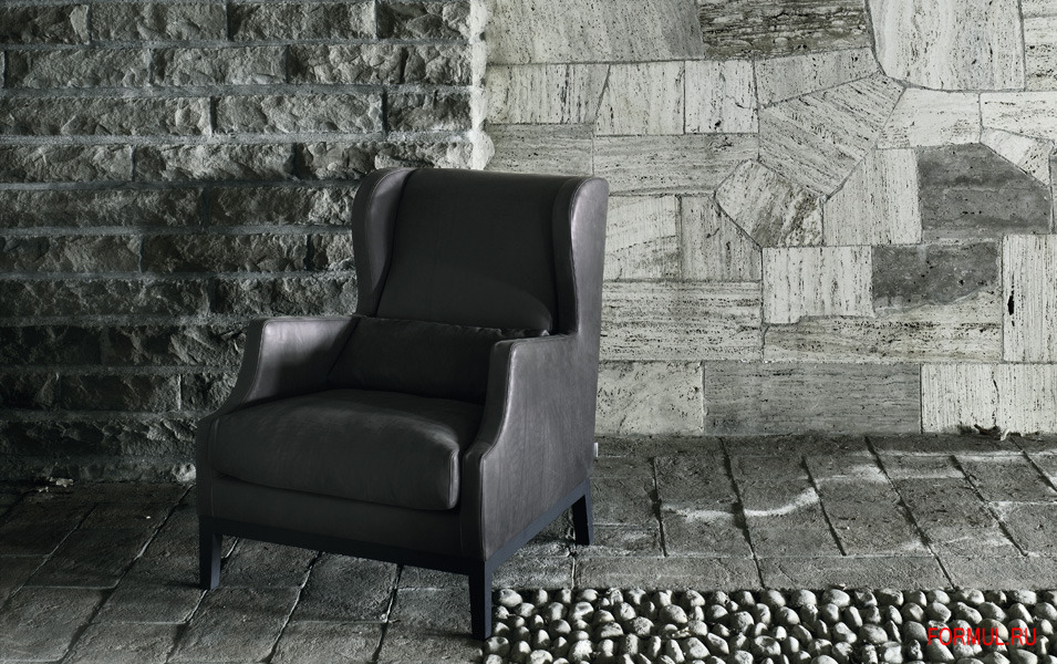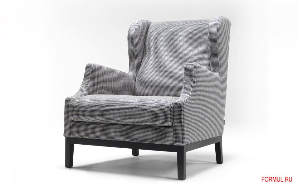 Кресло с небольшими "ушами". Ножки из массива дуба в натуральном оттенке / тонированного в цвет древесного угля. "Скрытый" каркас из фанеры тополя и сосны. Упругость придают эластичные ремни. Наполнитель – ППУ различной плотности, полиэстеровое волокно; ППУ различной плотности и стерилизованный гусиный пух (только подушка сиденья). Стационарная обивка – кожа. Съемная текстильная обивка снабжена замками-молниями и "липучками" Velcro.