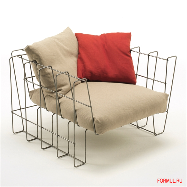 Кресло на "ажурном" металлическом каркасе, напоминающем корзинку для продуктов в супермаркете. Разноцветные подушки сиденья и спинки предлагаются в съемных текстильных чехлах, наполнитель - ППУ и натуральное волокно Painera. Модель можно использовать внутри помещения и на открытом воздухе.