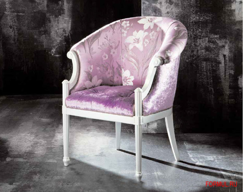 Кресло, спинка плавно переходит в подлокотники. Каркас покрыт белым лаком, сиденье и спинка сзади обита бархатом. Наполнение - полиуретан.