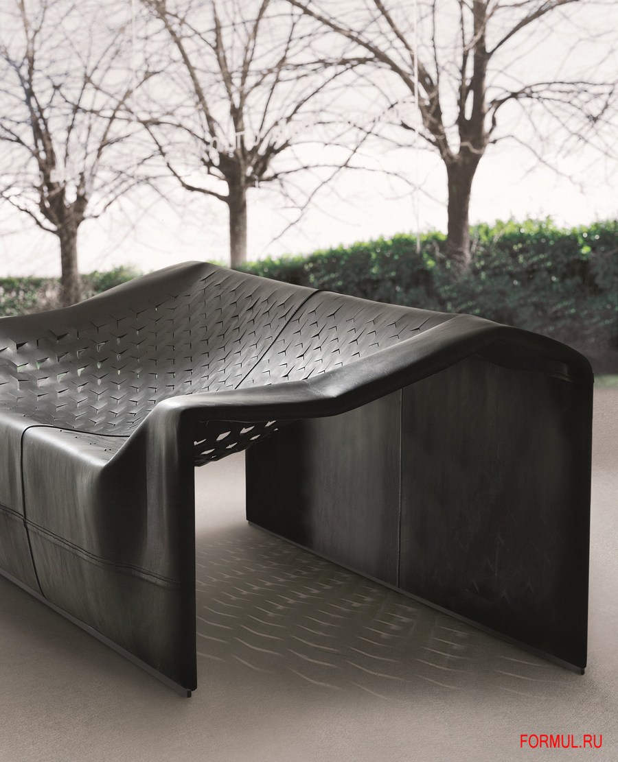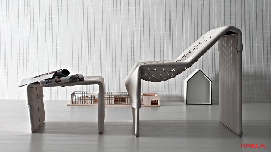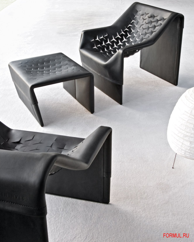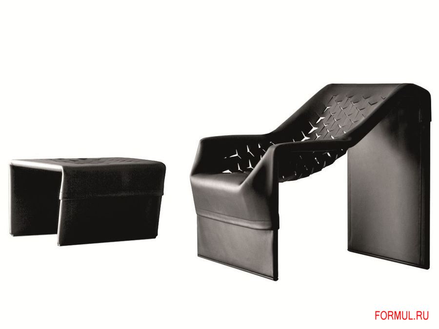 Обивка кресла не имеет аналогов — это двусторонняя кожа с самомоделирующимися геометрическими разрезами, доступная в черном и белом цвете.
