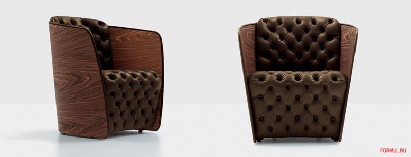 Кресло в соременном стиле из массива древесины. Отделка - прозрачный лак, шпон палисандра. Спинка и сиденье обтянуты текстилем. Наполнитель - ППУ различной плотности. Украшением служит декоративная стежка-капитоне.