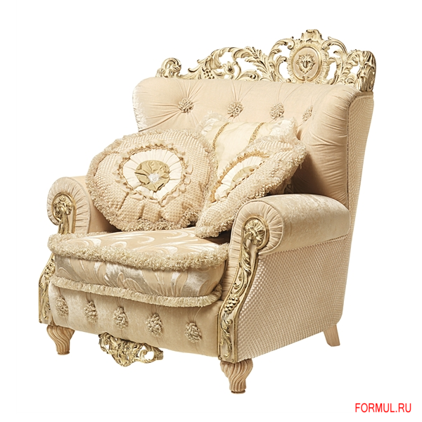 Кресло с подлокотниками-валиками – модель в классическом стиле. Опирается на точеные ножки. Основание, фронтальная часть подлокотников и верх спинки украшены резными элементами (ручная работа) из массива древесины. В обивке сочетается текстиль двух видов – однотонный и с растительным рисунком. Спинка и основание оформлены стежкой-капитоне, где вместо пуговиц использованы текстильные цветы.