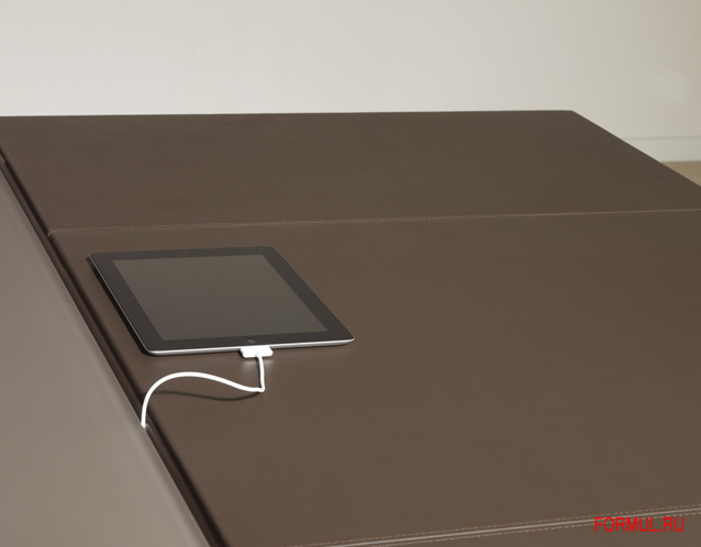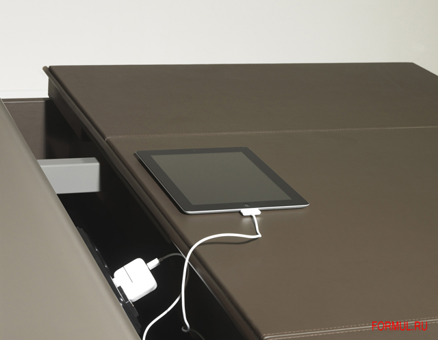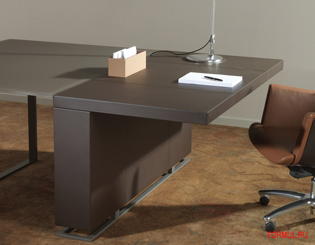 Дек — это система для оформления офиса руководителя, нацеленная подчеркнуть характер пересекаемости работы и повседневной жизни. Тщательно подобранное сочетание кожи, дерева и металла подчеркивает различные функциональные зоны: зрительное восприятие, организация, витрина, работа, прием посетителей. Массивные формы кажется парят над легкой основой из металла, служащей соединительным мостом. Совокупность заполненных пространств и горизонтальных линий создает сбалансированное сочетание прочности и легкости.