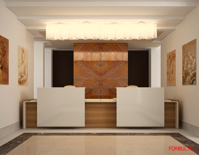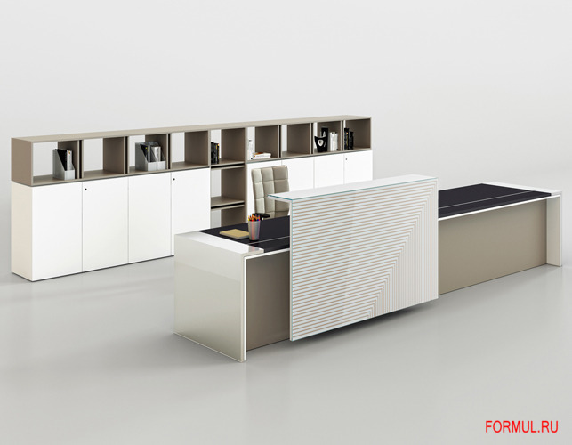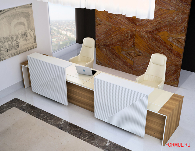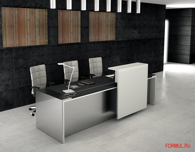 Зона, посвященная гостеприимству. Луп выделяет элегантность структуры, выполненной в двух тонах, и стеклянный экран, разделяющий посетителя и того, кто находится с противоположной стороны стойки. Графическая отделка и тщательный выбор материалов приемной стойки еще раз подтверждают ее яркое корпоративное тождество.
