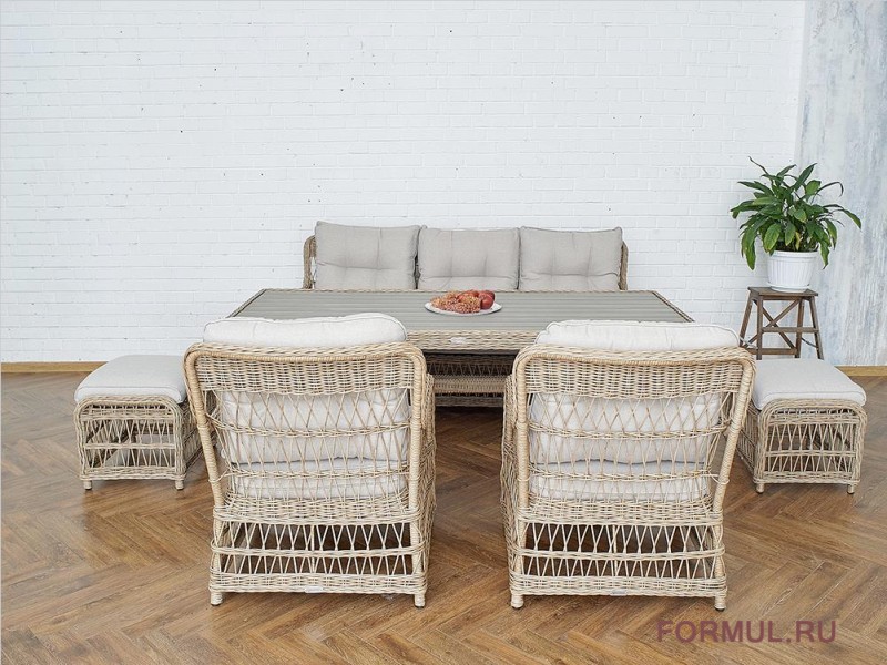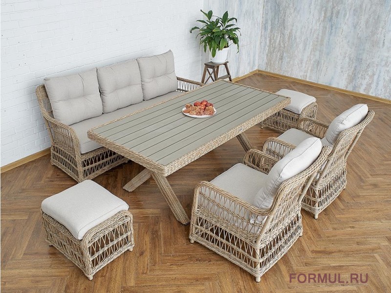 Комплектация: обеденный стол, 3-местный диван, 2 кресла, 2 пуфа